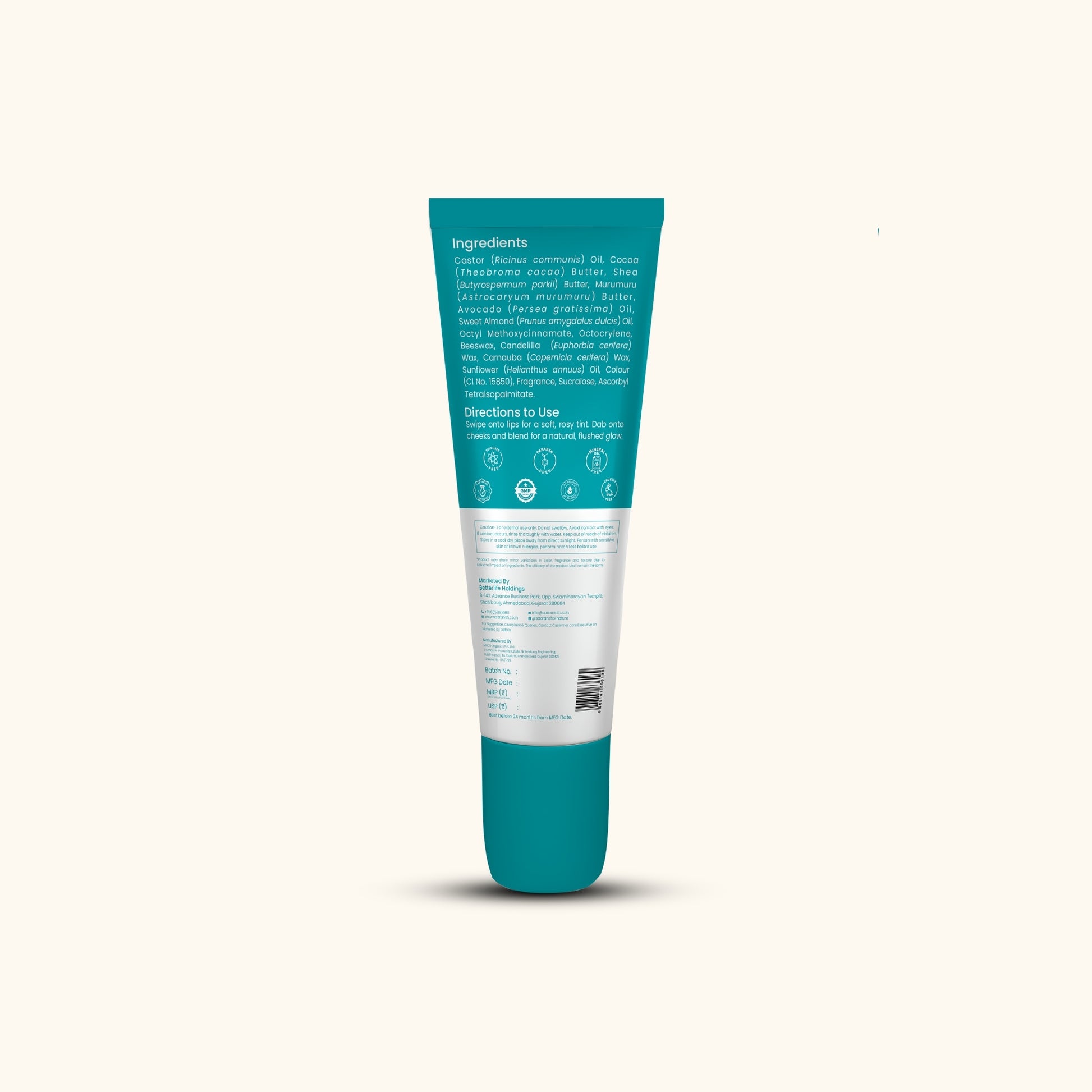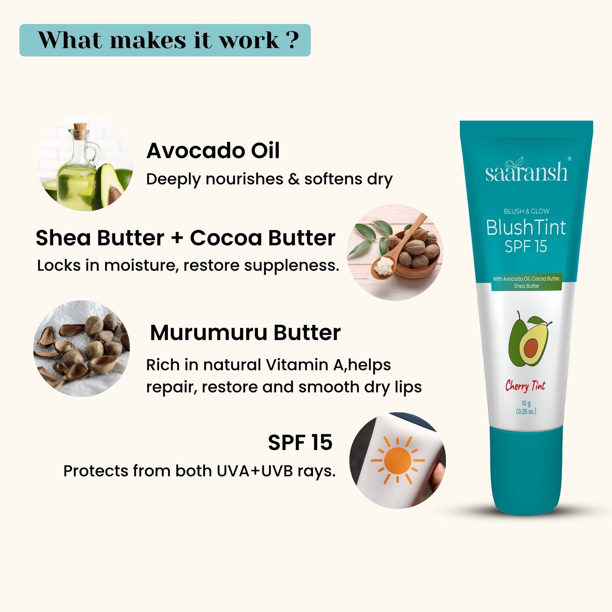 Saaransh BlushTint SPF 15 is a luxurious blend of nourishing butters and oils, offering sheer color, deep hydration, and daily sun protection in one smooth swipe.