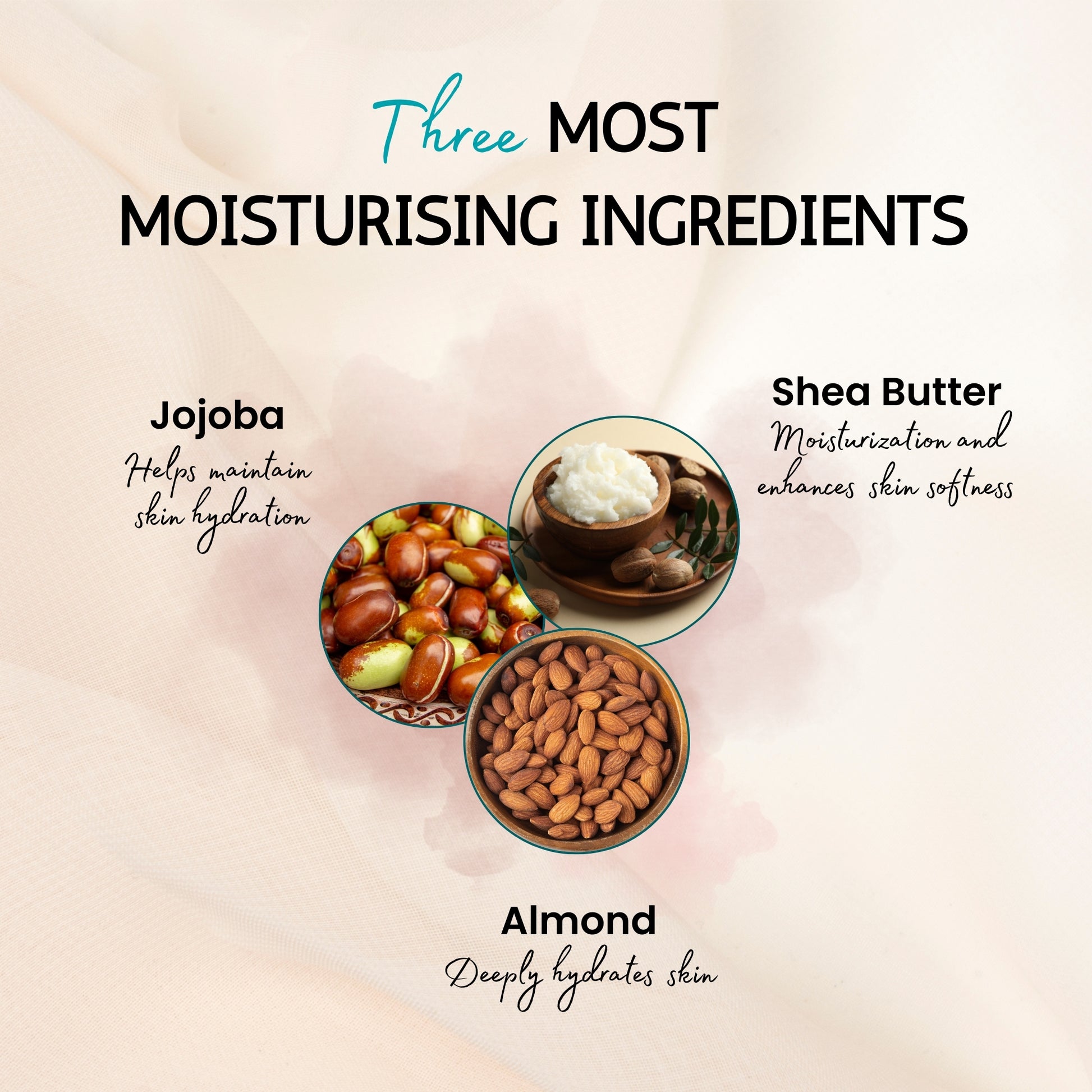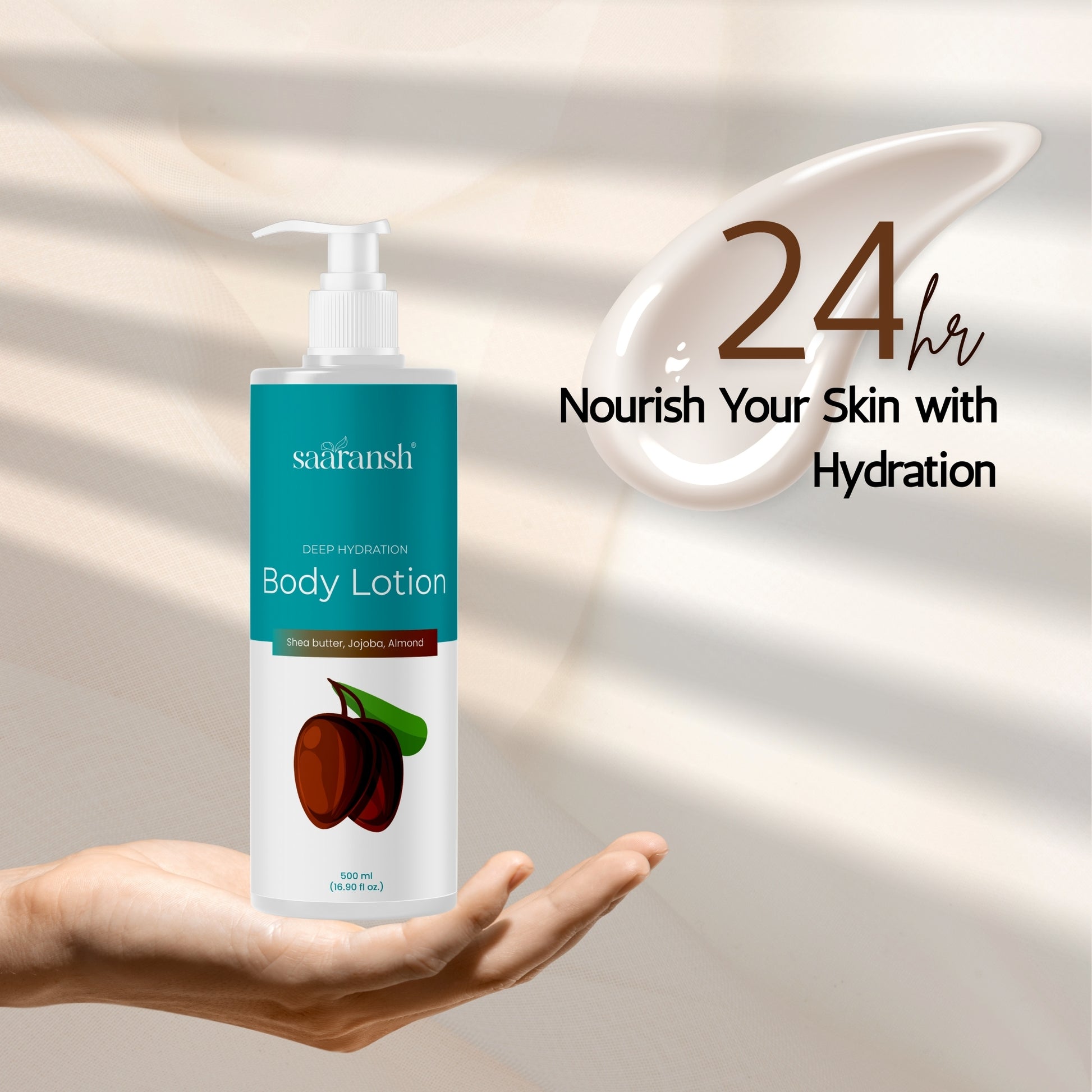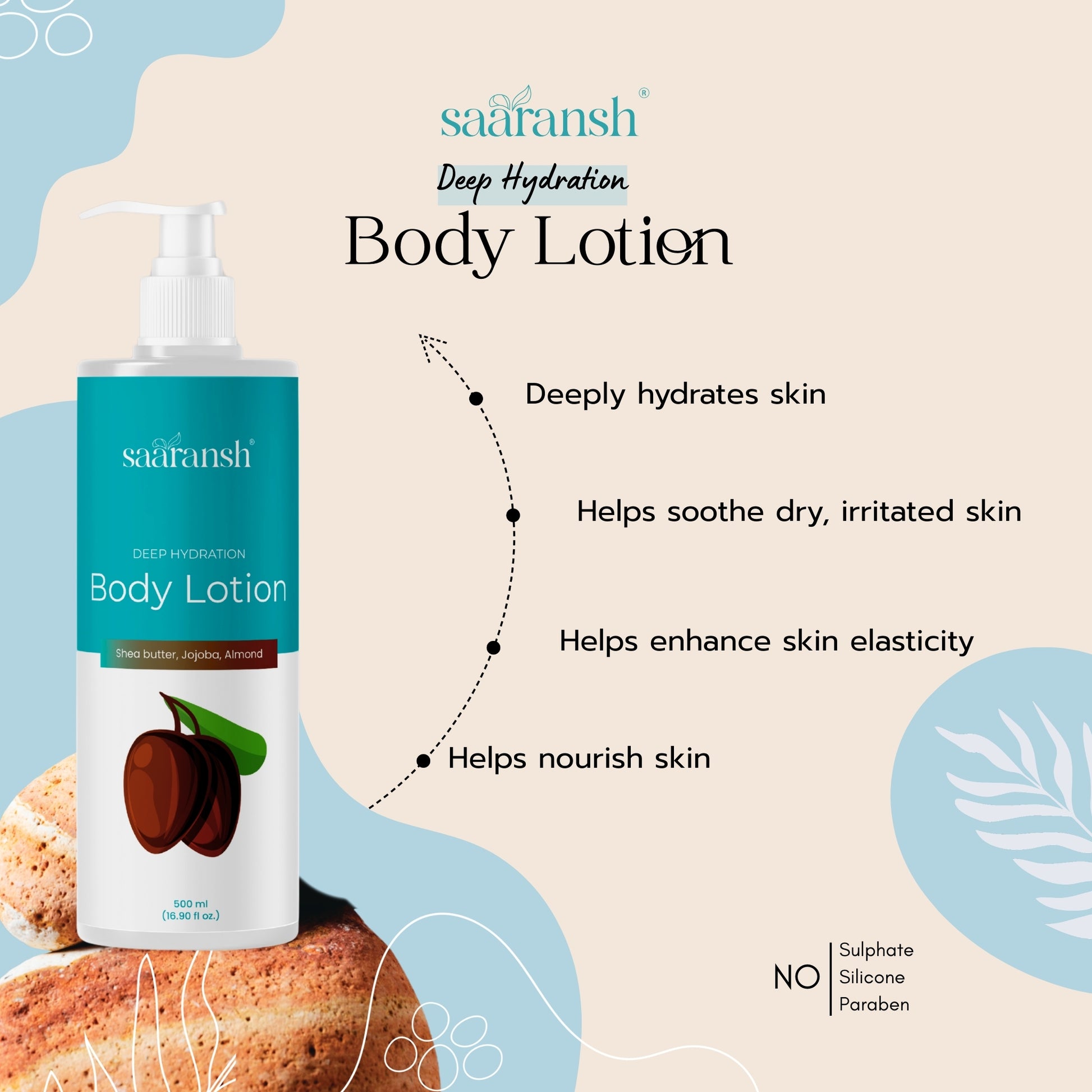 Saaransh Body Lotion is enriched with Shea butter, Almond oil, Jojoba oil, Rose oil, and other ingredients.