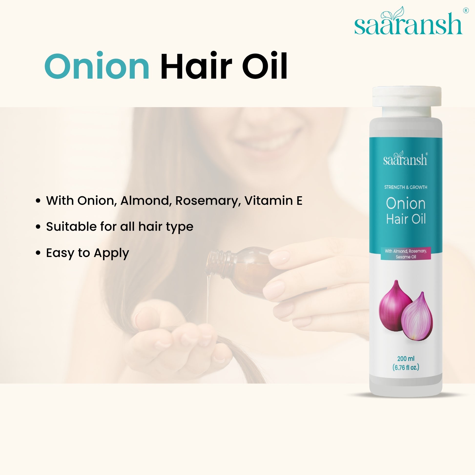 Saaransh Onion Hair Oil is enriched with Onion Oil, Onion Seed Oil, Sesame Oil, Rosemary, and other herbs.